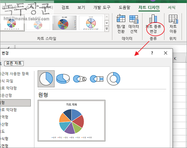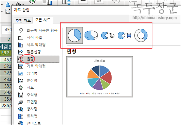 ▼ 차트 삽입 창이 뜨면 모든 차트 탭 > 원형 메뉴를 선택합니다. 오른쪽 차트 목록에서 원형을 선택합니다.