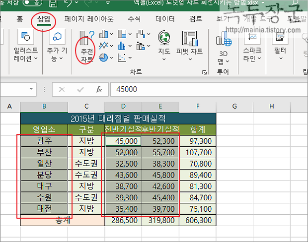 ▼ 먼저 2차원 원형 차트를 만들어 보겠습니다. 차트에 들어갈 범례와 데이터 영역을 선택합니다. 다음 상단 리본 메뉴 삽입 탭 > 추천 차트 를 클릭합니다.