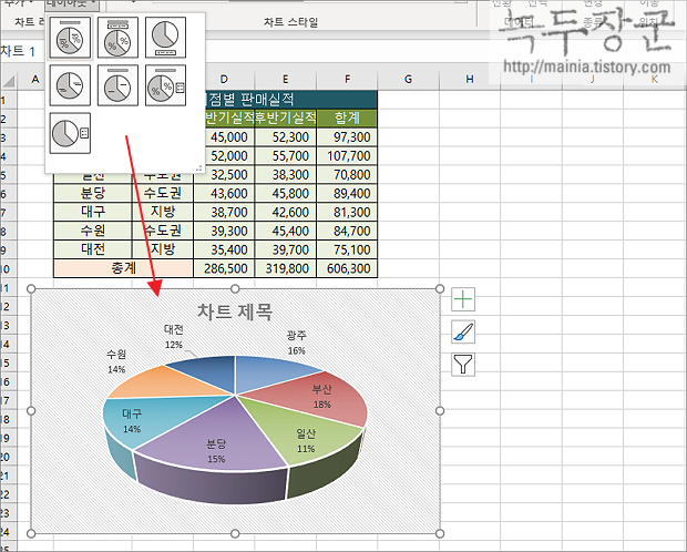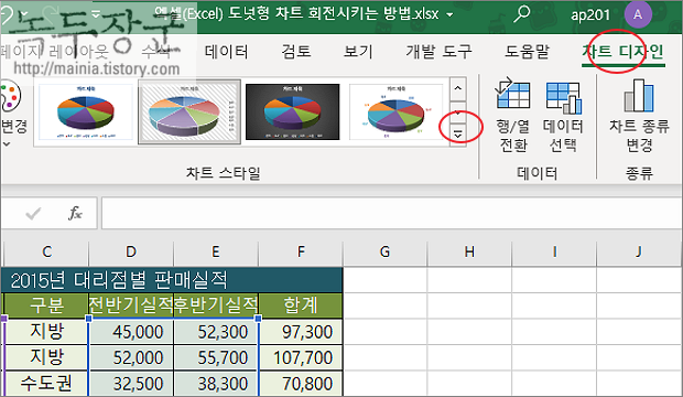 ▼ 변경한 3차원 원형 차트가 마음에 들지 않는다면 차트 스타일을 이용해서 변경해 보세요. 차트 디자인 > 차트 스타일 메뉴에서 오른쪽 끝에 확대 화살표를 클릭합니다.