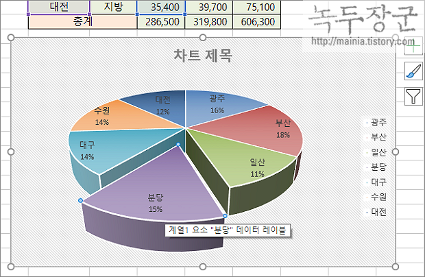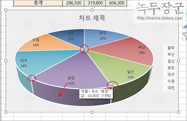 ▼ 강조하고 싶은 계열이 있다면 파이 조각을 분리해서 떨어뜨려 보세요. 방법은 간단합니다. 우선 분리할 파이 조각을 하나만 선택합니다. 그리고 마우스로 누른 상태에서 이동합니다.