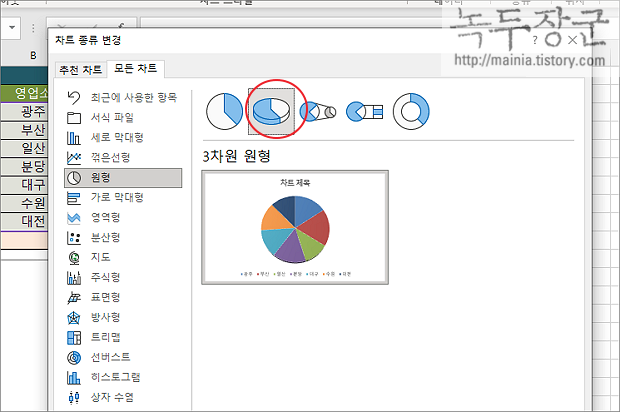 ▼ 차트 종류 변경 창에서 모든 차트 > 원형 > 3차원 원형 차트를 선택합니다.