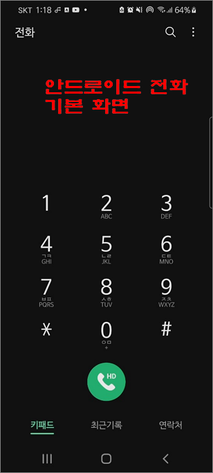 ▼ 안드로이드 전화 걸기 기본화면은 다음과 같습니다. 다크모드로 설정이 되어 있어서 바탕이 블랙입니다.