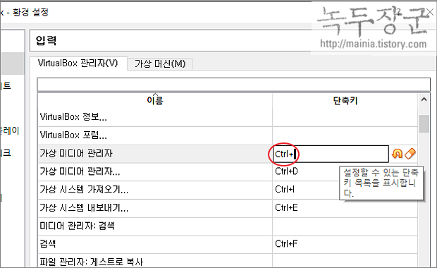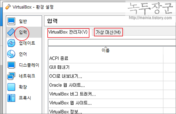 ▼ 환경 설정 창에서 입력 메뉴를 선택합니다. 입력에는 두 종류의 단축키 그룹이 있습니다. 버추얼머신 관리자 기능 단축키와 설치한 윈도우 가상 머신 단축키로 나누어집니다.