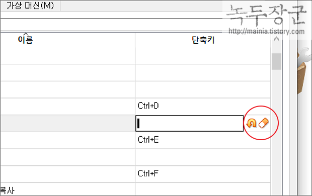 ▼ 에디터 박스 오른쪽 끝에 두 개의 아이콘 버튼은 "기본값복원" 과 "단축키 해제" 입니다. 이전 단축키로 돌아가고 싶다면 "기본값복원" 메뉴를 클릭합니다.