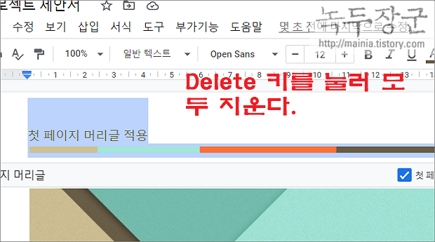 ▼ 두 번째 방법은 머리글에 입력된 내용을 드래그해서 선택한 뒤 모두 지우는 것입니다.