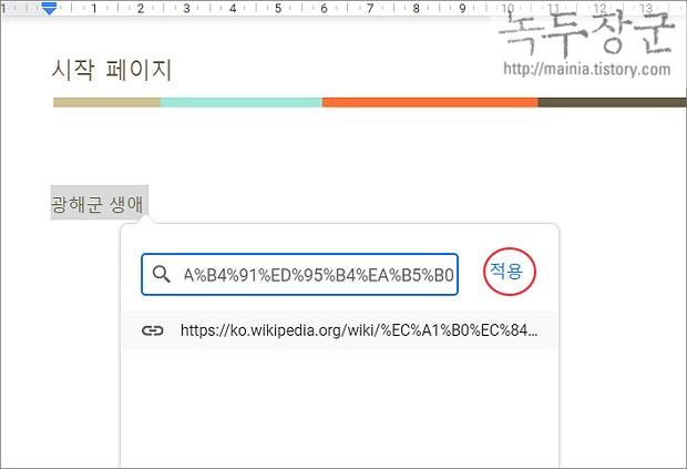 ▼ 링크 주소 입력란에 Ctrl + V 를 눌러 이전에 복사한 텍스트를 붙여 넣습니다. 오른쪽 끝으로 가서 적용 버튼을 눌러 완료합니다.