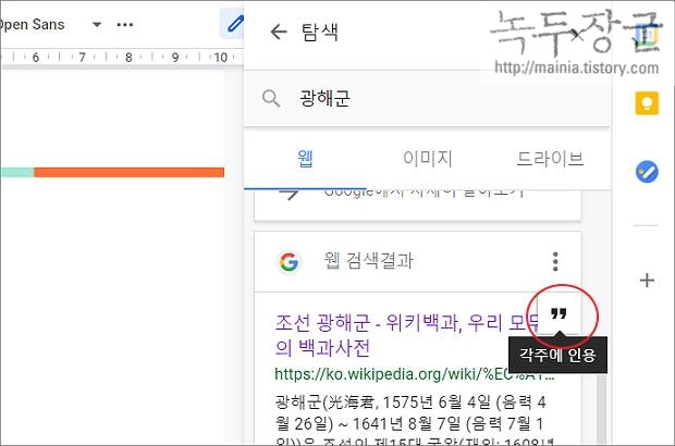 ▼ 그림처럼 각주에 인용 메뉴를 선택하면 자동으로 링크와 타이틀이 각주로 추가가 됩니다.