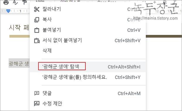 ▼ 다음은 링크를 추가하는 방법입니다. 링크를 추가할 문장을 선택합니다. 오른쪽 마우스를 눌러 "xxxx 탐색" 메뉴를 클릭합니다. 해당 문장을 바로 탐색기에서 검색하는 방법입니다.