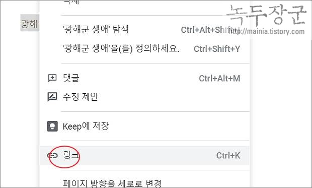 ▼ 다음 링크를 추가할 문장으로 가서 오른쪽 마우스를 클릭합니다. 메뉴 목록에서 링크를 선택해 줍니다.