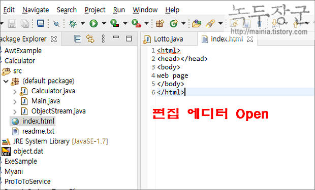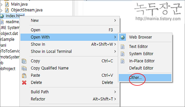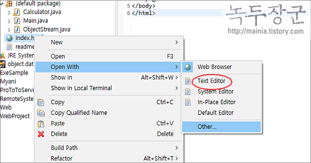 ▼ html 파일을 편집하고 싶다면 Web Browser 가 아닌 Editor 로 열어야 합니다. 파일을 선택하고 오른쪽 마우스를 눌러 Open With > Text Editor 메뉴를 선택합니다.