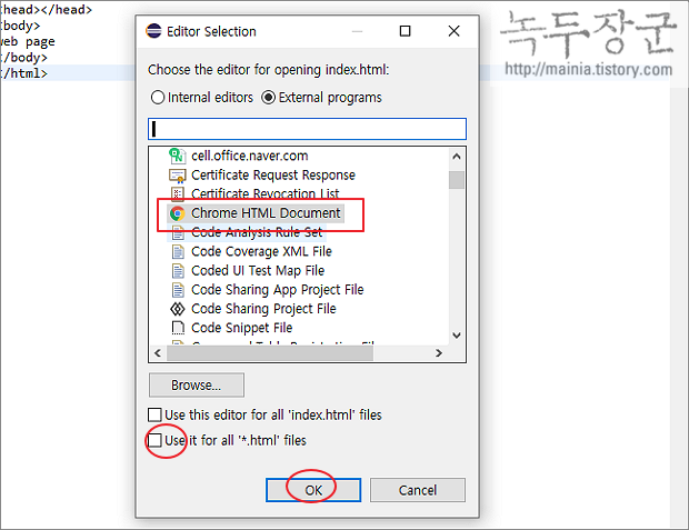 ▼ Editor Selection 창이 뜨면 목록에서 Chrome HTML Document 를 찾습니다. 그리고 HTML 파일의 기본 브라우저로 등록하기 위해 Use it for all '*.html' files 옵션을 체크하고 Ok 버튼을 클릭합니다.