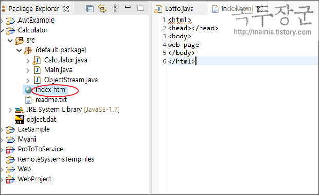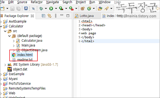 ▼ 샘플로 html 파일을 추가했습니다. 인터넷 파일은 자동으로 브라우저 에디터와 연결이 됩니다. 그래서 파일을 더블 클릭하면 바로 열 수 있습니다.