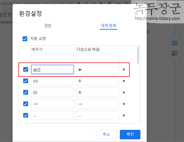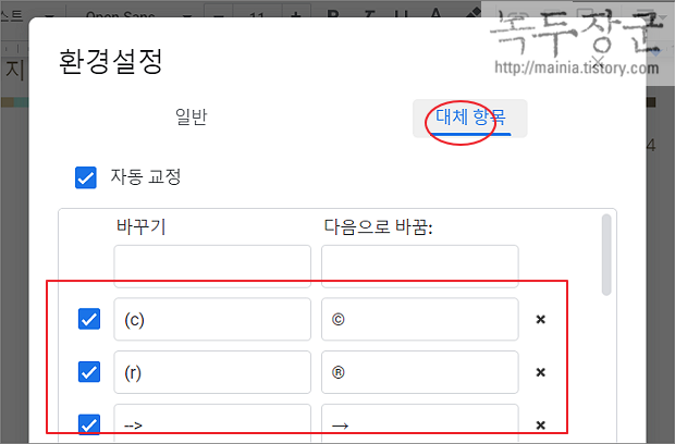 ▼ 환경설정 화면에서 대체 항목 탭을 클릭합니다. 대체 항목 목록에서 어떤 일반 문자가 특수 문자로 전환할 수 있는지 확인해 보세요.