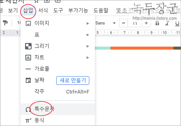 ▼ 다음은 자주 사용하는 특수 문자를 대체 문자로 등록해 보겠습니다. 먼저 문서 도구에서 지원하는 특수 문자 목록을 보겠습니다. 삽입 > 특수문자 메뉴를 선택합니다.