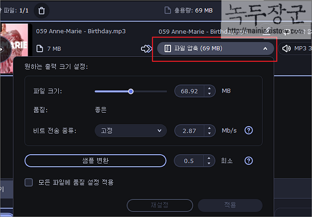 ▼ 목록에 편집할 음원 파일인 MP3 은 변환하기 전에 여러 옵션을 조절해서 품질을 변경할 수 있습니다. 전문가가 아니라면 기본 설정 그대로 이용합니다.