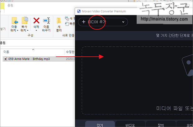 ▼ 영상이 없는 음원 파일인 MP3 를 MP4 동영상으로 변환하는 방법을 알아보겠습니다. 동영상으로 변환되면 화면에 앨범자켓으로 사용한 이미지가 나타납니다. 먼저 Movavi Converter 에 미디어를 추가합니다. 파일을 마우스로 드래그하거나 미디어 추가 버튼을 이용합니다.