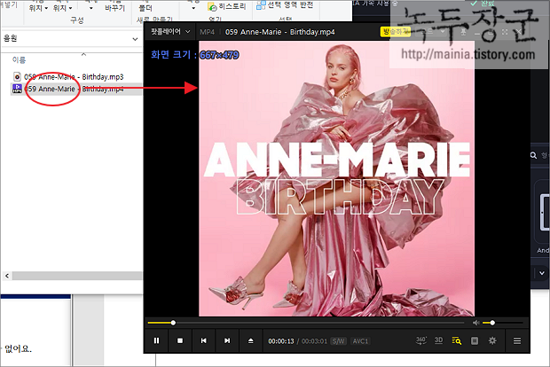 ▼ 변환한 mp3 에서 mp4 로 변환한 동영상을 플레이어로 띄워보세요. 그림처럼 mp3 에 내장되어 있는 자켓 이미지가 동영상 전체에 나타나게 됩니다.
