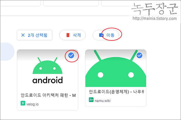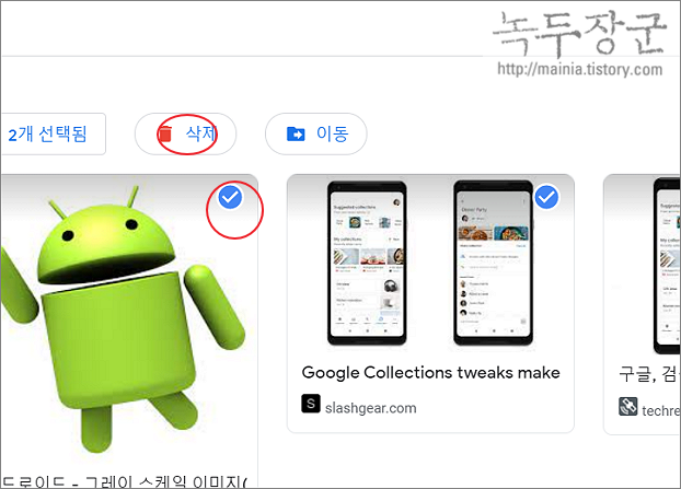 ▼ 이미지는 이전에 만든 "검색이미지 컬렉션" 으로 바로 추가할 수 없기 때문에 "즐겨찾는 이미지" 에서 "검색이미지 컬렉션" 으로 이동을 시켜야 합니다. 선택 버튼을 눌러 항목 선택 옵션을 활성화합니다. 이동할 이미지를 체크하고 이동 버튼을 클릭합니다.