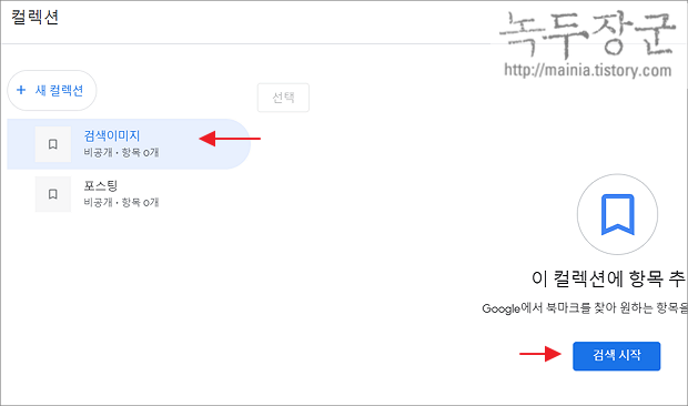 ▼ 자료를 수집해서 저장할 컬렉션 생성이 끝났습니다. 이제 검색을 이용해서 수집할 자료를 찾겠습니다. 오른쪽 화면으로 가서 검색 시작 버튼을 클릭합니다.