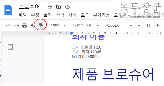 ▼ 구글 문서에서 서식 복사 메뉴는 왼쪽 상단 4번째 툴바로 페인트 브러쉬 모양입니다.