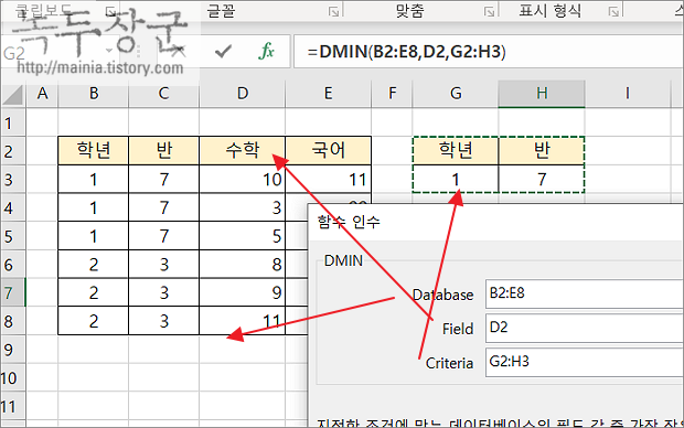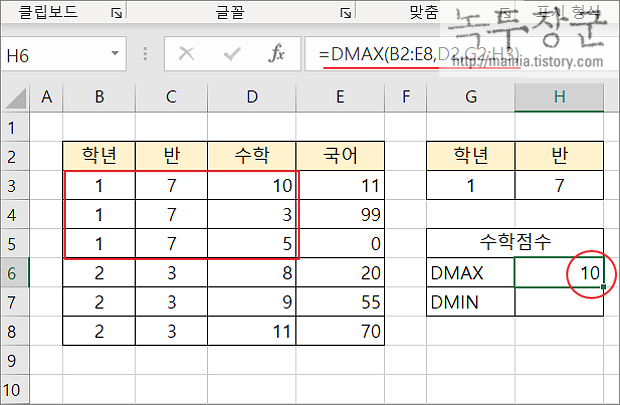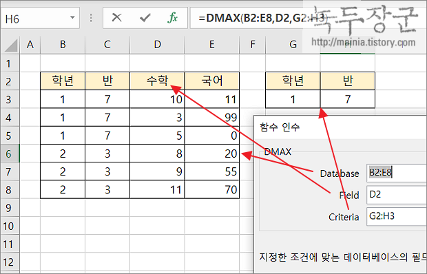 ▼ DMAX 의 파라미터는 3개입니다. 첫 번째 파라미터인 Database 에는 제목을 포함한 표 전체 영역을 입력합니다. 두 번째 Field 에는 "수학" 열의 시작 셀 주소를 입력합니다. 세 번째 Criteria 는 검색 조건이 들어갑니다. 여기에는 검색할 값 뿐만 아니라 제목이 들어간 영역을 지정해야 합니다.