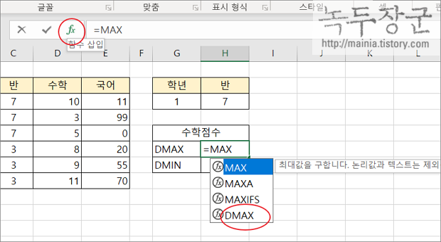 ▼ 1학년, 7반 학생 중에서 최고값을 찾기 위해 DMAX 함수를 이용해 보겠습니다. DMAX() 함수를 검색해서 추가합니다.