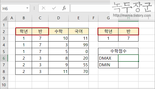 ▼ 샘플 데이터의 오른쪽 표에서 조건에 해당하는 “학년”과 “반” 에 “수학” 최고/최소 점수를 찾고자 합니다. 함수는 DMAX 와 DMIN 을 사용할 것입니다. 다른 함수와 달리 D 가 붙은 데이터베이스 함수는 표의 제목에 해당하는 필드명까지 조건에 넣어야 합니다. 왜냐하면 필드명이 동일한지 확인하면서 데이터를 찾기 때문입니다.