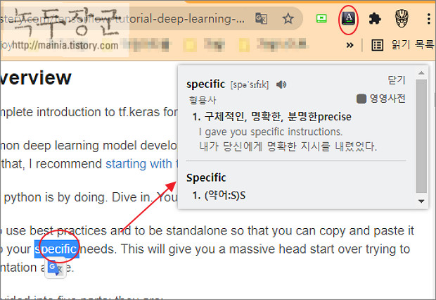 ▼ 설치가 끝난 네이버 사전을 사용해 보겠습니다. 웹 페이지 내에서 검색하고 싶은 영어 단어를 더블 클릭해 보세요. 기본 설정에 의해서 화면 오른쪽 상단에 사전 검색 결과가 나타납니다.