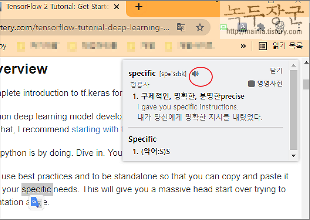 ▼ 네이버 사전 페이지와 같이 스피커 아이콘을 클릭하면 음성으로 발음을 들을 수 있습니다.