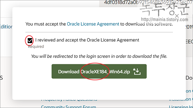 ▼ 팝업창에서 상단 "I reviewed and accept the Oracle License Agreement" 를 체크하고 바로 아래 다운로드 버튼을 클릭합니다.
