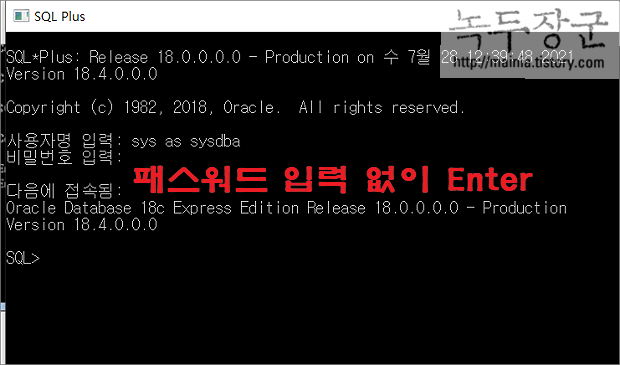 ▼ 관리자로 접속하는 방법은 다음과 같습니다. 사용자 명에 sys as sysdba 로 입력하고 패스워드에는 값을 입력하지 않습니다.