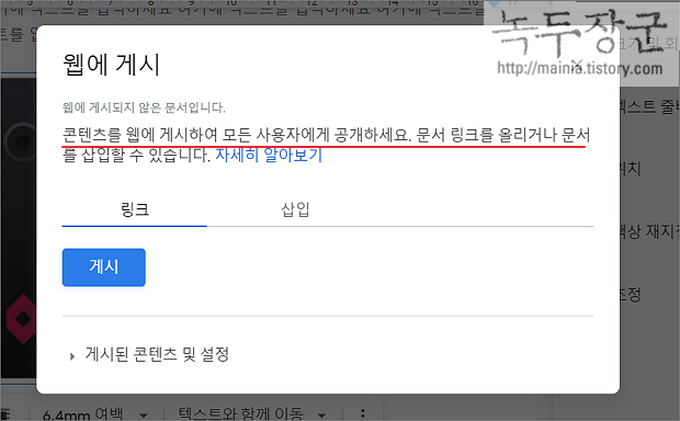 ▼ 문서 전체를 웹에 게시할 때 사용하는 설정 화면이 팝업으로 나타납니다. 설명에도 나와 있듯이 웹에 게시한 문서는 누구나 볼 수 있도록 공개됩니다. 사내 문서이거나 보안문서라면 웹에 게시하지 않는 것이 좋겠죠.