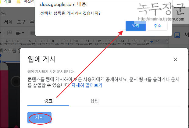 ▼ 게시 버튼을 누르면 정말 게시할 것인지 묻는 팝업창이 뜹니다. 확인을 눌러 게시를 시작합니다.