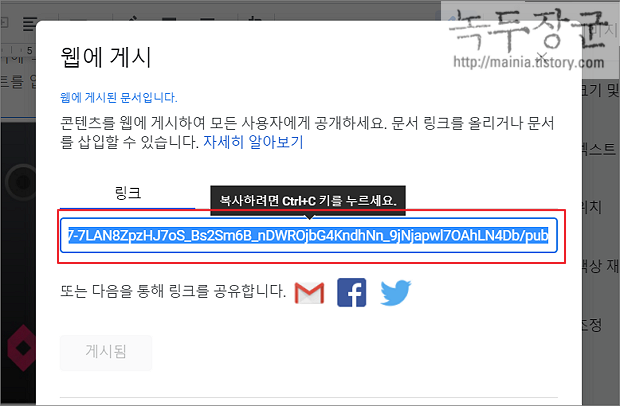 ▼ 웹 게시를 위한 창이 나타나면 중앙에 게시할 웹 주소를 클립보드에 복사합니다. Ctrl + C 키를 눌러 복사합니다.