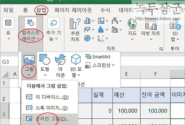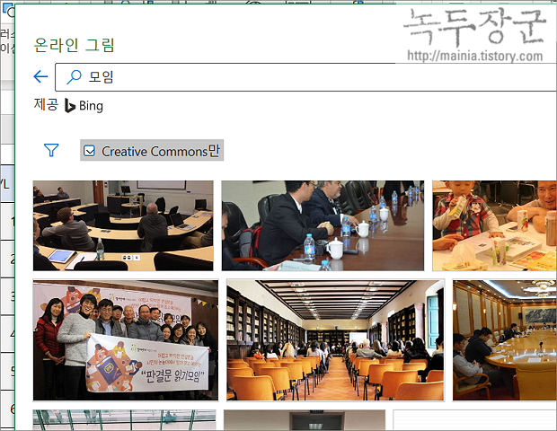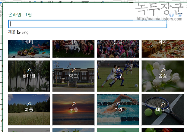 ▼ 시트에 표시할 이미지가 필요한 경우 엑셀에서 인터넷을 연결해 바로 추가할 수 있습니다. 단, 검색엔진은 Bing 입니다.