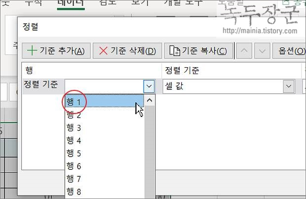 ▼ 정렬 기준을 숫자를 입력한 첫 번째 행인 “행 1” 로 선택합니다.