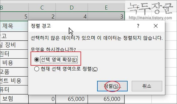 ▼ 정렬 경고 팝업창이 뜨면 “선택 영역 확장” 을 선택하고 바로 아래 정렬 버튼을 클릭합니다.