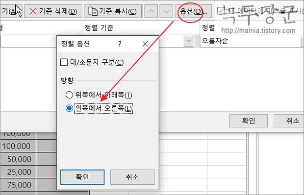 ▼ "왼쪽에서 오른쪽" 열 순서를 바꾸기 위한 옵션입니다. "위쪽에서 아래쪽" 은 행의 순서를 바꿀 수 있겠죠.