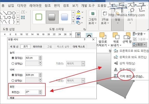 ▼ 정해진 각도가 아닌 원하는 각도를 입력해서 도형을 회전 시킬 수도 있습니다. 회전 하위 메뉴에서 제일 아래에 있는 "기타 회전 옵션" 를 클릭합니다. 팝업창이 뜨면 회전 항목에 각도를 입력합니다.