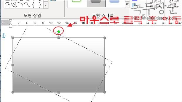 ▼ 도형을 회전시키기 위해 도형 상단에 녹색점을 마우스로 누릅니다. 화면에는 회전 표시를 나타내는 아이콘이 나타나는데, 마우스를 누른 상태에서 시계나 시계 반대 방향으로 돌리면 회전합니다.
