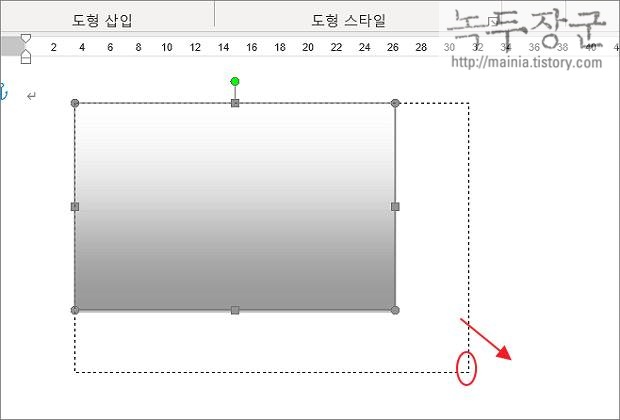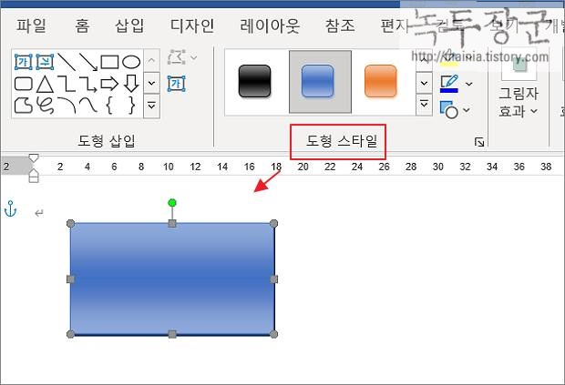 ▼ 도형을 문서에 추가하기 위해서는 마우스를 클릭해서 시작 점을 만든 후 드래그해서 크기를 정합니다. 빠른 도형 디자인을 위해서 상단 도형 스타일을 메뉴를 이용합니다. 목록에 원하는 디자인을 선택하면 한번에 적용할 수 있습니다.
