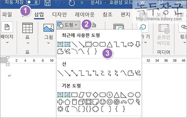 ▼ 문서에 도형을 추가 하기 위해 삽입 탭 > 도형 리본 메뉴로 갑니다. 리본 메뉴의 화살표를 클릭하면 다양한 도형 목록을 볼 수가 있습니다. 여러 도형 중에서 하나를 선택한 후 추가합니다.