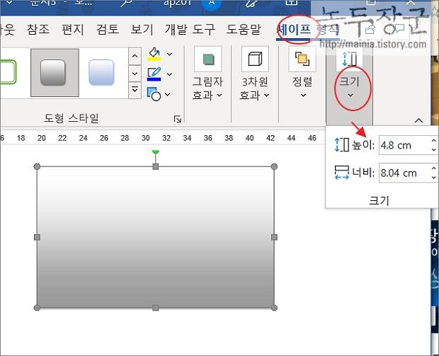 ▼ 직접 수치를 입력해서 조절할 수도 있습니다. 도형을 선택하고 세이프 형식 > 크기 리본 메뉴를 클릭합니다. cm 단위의 높이, 너비 값을 입력해서 도형의 크기를 지정합니다.