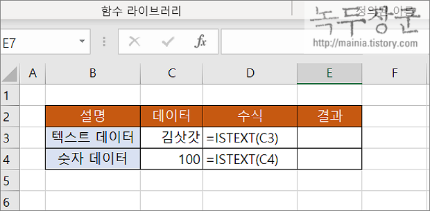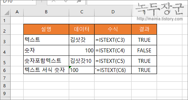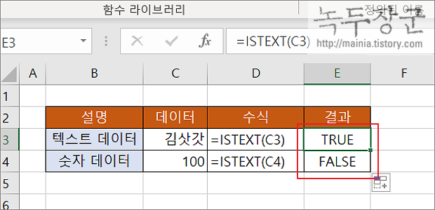 ▼ 텍스트가 포함된 데이터를 판단하는 함수는 ISTEXT 입니다. 함수의 매개변수는 하나이며, 셀 참조 또는 값을 입력합니다. 반환값은 True/False 중 하나입니다.