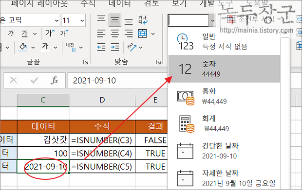 ▼ ISTEXT 와 반대로 숫자인 경우 TRUE 를 반환하는 함수가 있습니다. 바로 ISNUMBER 입니다. 샘플 데이터처럼 ISTEXT 와 반대의 결과가 나왔습니다.