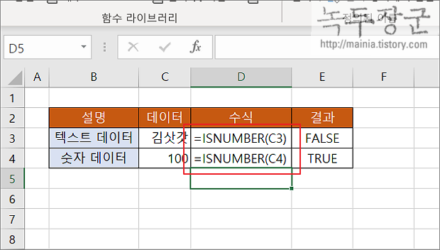 엑셀에서 셀에 포함된 데이터가 숫자/텍스트 여부를 판단하는 함수가 있습니다. 이 함수는 수식에서 계산에 필요한 셀을 참조할 때 많이 이용합니다. 셀 데이터가 숫자가 아닌 텍스트인 경우 연산에 오류가 발생할 수 있기 때문입니다.