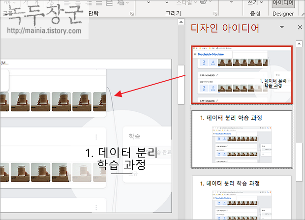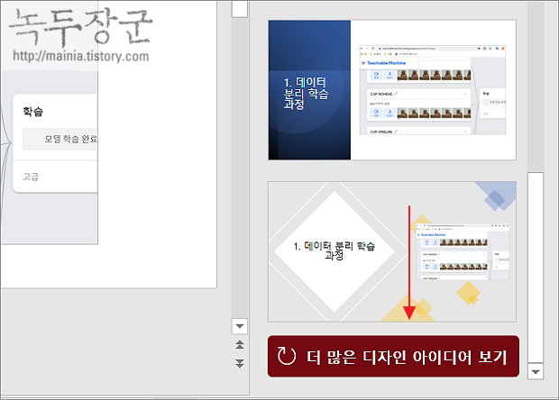 ▼ 오른쪽 화면 사이드에 디자인 아이디어 창이 나타납니다. 이곳에서는 슬라이드에 포함된 컨텐츠 구성에 맞는 디자인을 제안합니다. 아래로 내려서 마음에 드는 디자인이 있는지 찾습니다.