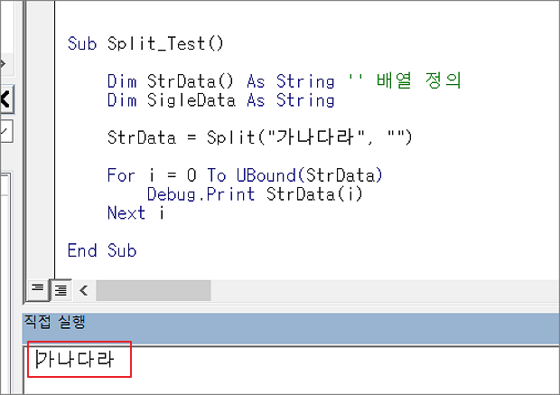 ▼ VBA에서는 문자를 나눌 때 Split 함수를 사용합니다. Split 함수의 매개변수는 두 개입니다. 두 번째 들어가야할 값이 문자를 나눌 때 사용할 구분자입니다. 아래 샘플 함수는 공백을 기준으로 문자를 나눈 결과값 배열 객체를 반환합니다.