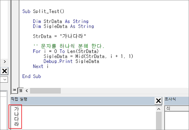 ▼ 문자를 하나씩 분리하기 위해서는 Mid 함수를 이용해서 한 칸씩 이동하면서 잘라야 합니다. 먼저 문자를 분리하기 위해 For 반복문을 만듭니다. 반복횟수는 문자열의 길이값입니다. Len() 함수를 통해서 길이를 파악할 수 있습니다. For 문 안에서는 Mid() 함수로 글자 하나씩 분리합니다.