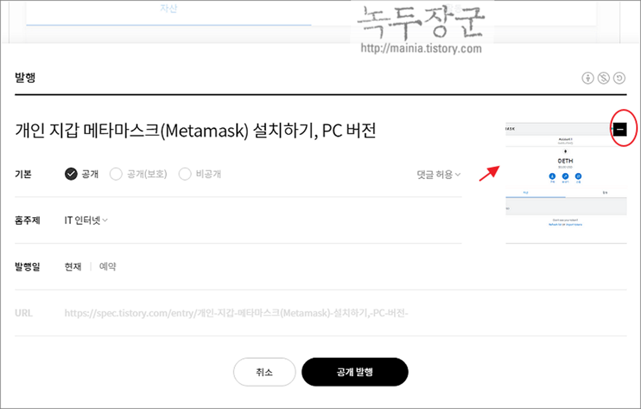 ▼ 발행 버튼을 누르면 화면 오른쪽에 썸네일로 사용할 이미지가 나타납니다. 첫 번째로 자신의 PC 에 별도의 썸네일 이미지가 있을 때 적용 방법입니다. 기본 썸네일 이미지 제거를 위해 오른쪽 상단 마이너스 버튼을 눌러 삭제합니다.